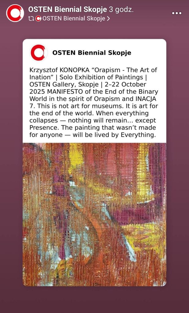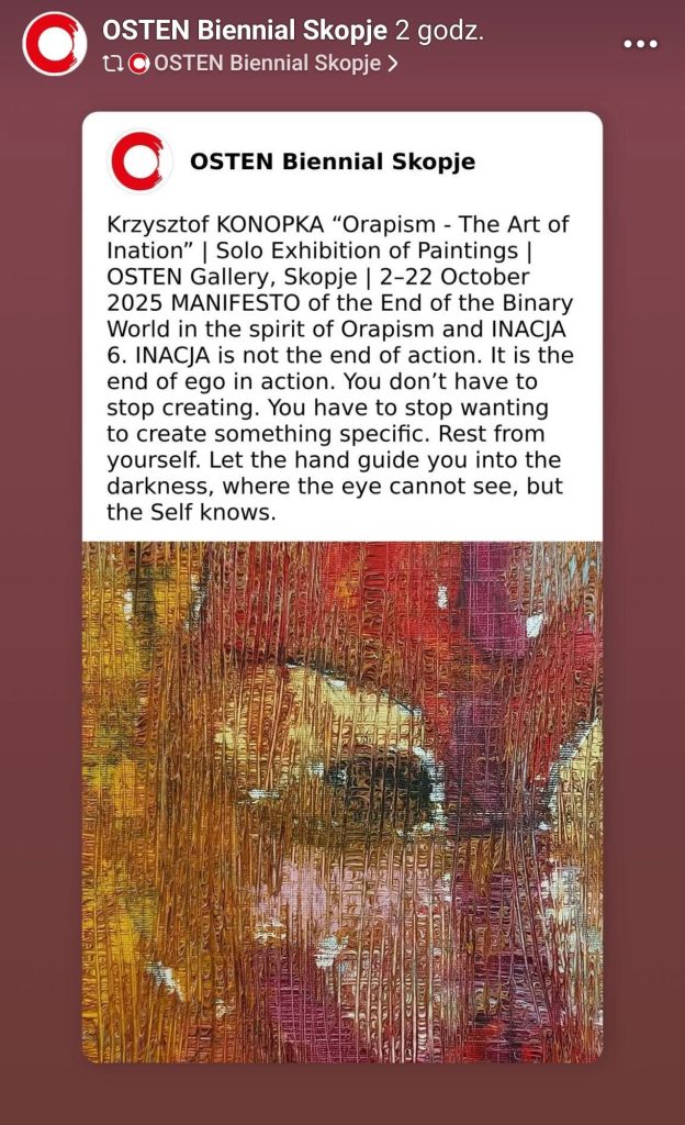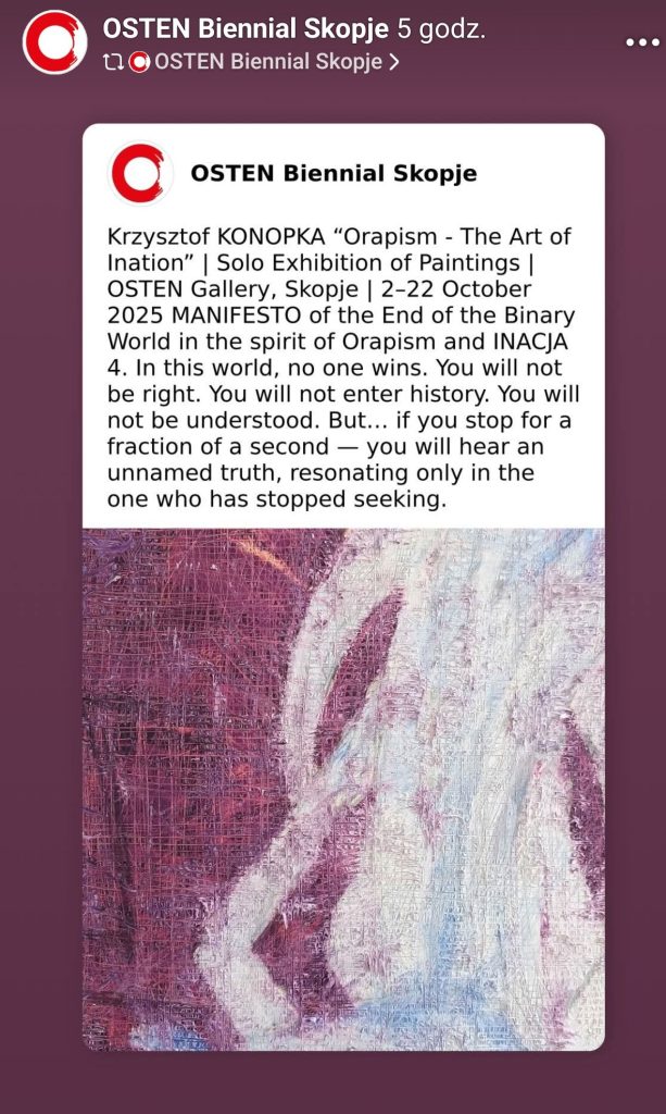 It is not a technique. It is a decision not to control the Source. The painting is not a result. The painting is a passage – of the Self through the body, of the Source through the gesture. INACJA is the moment when the hand creates, but consciousness falls silent. It is a surrender—to not correct the Truth and not overshadow the light with oneself.