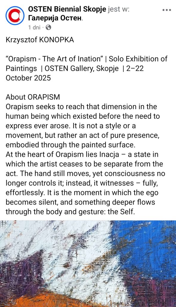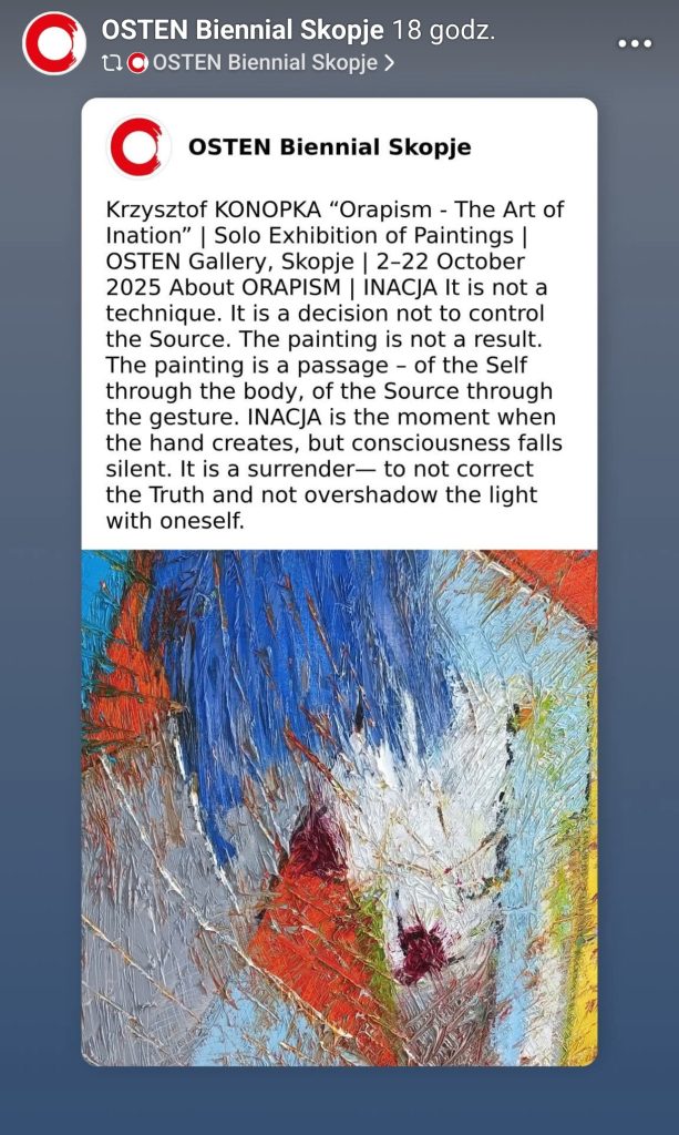 At the heart of Orapism lies Inacja – a state in which the artist ceases to be separate from the act. The hand still moves, yet consciousness no longer controls it; instead, it witnesses – fully, effortlessly. It is the moment in which the ego becomes silent, and something deeper flows through the body and gesture: the Self.